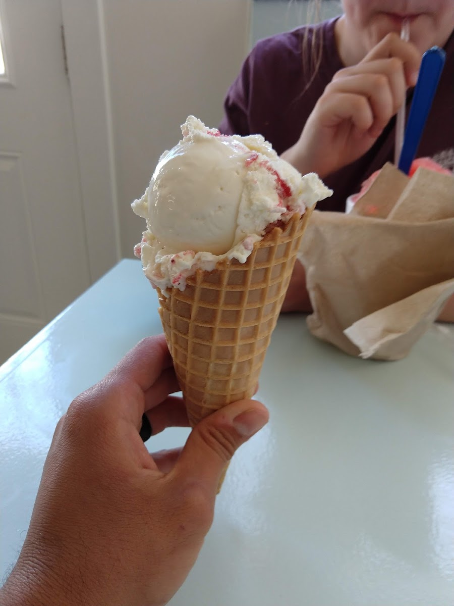 Had two scoops of strawberry cheesecake and two scoops of coconut flavored ice cream in a cup. Thing is the nice young lady kept scooping up the ice cream until it looked like a delicious pile of mashed potatoes. That earned her a tip. All seating is outdoors and people basically eat and leave so there is always seating. We walked over but everyone else tried cramming their cars into the little paved parking lot. Next to it they have a big beautiful gravel parking lot for the overflow. Try it!!
